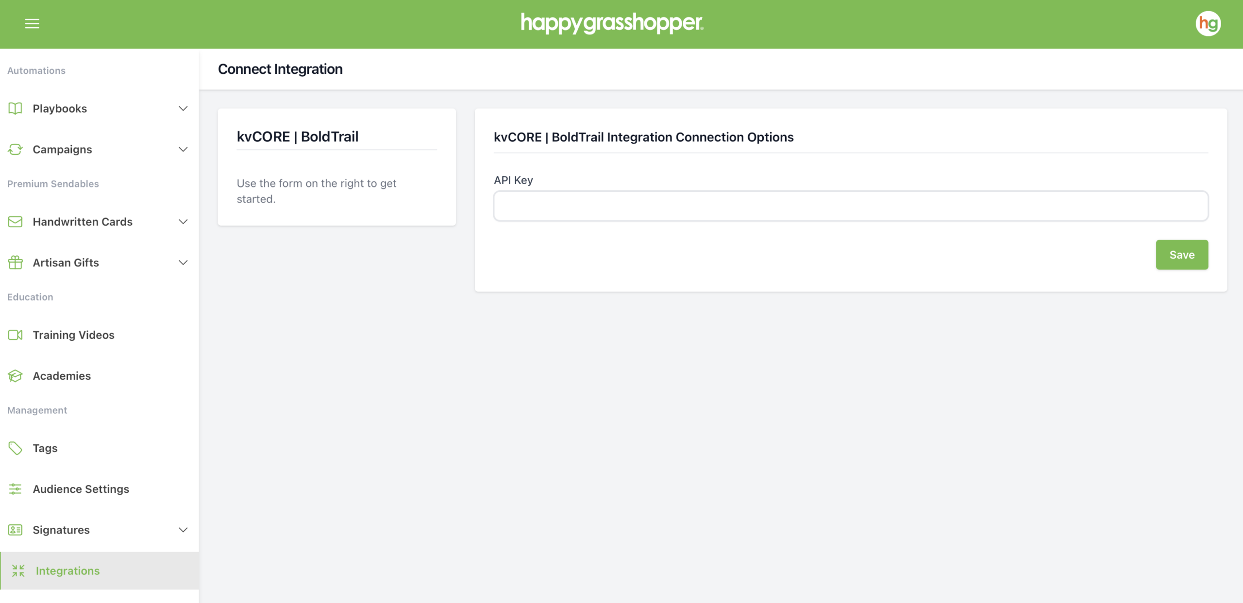 In Happy Grasshopper's left-hand menu, scroll down and click Integrations.