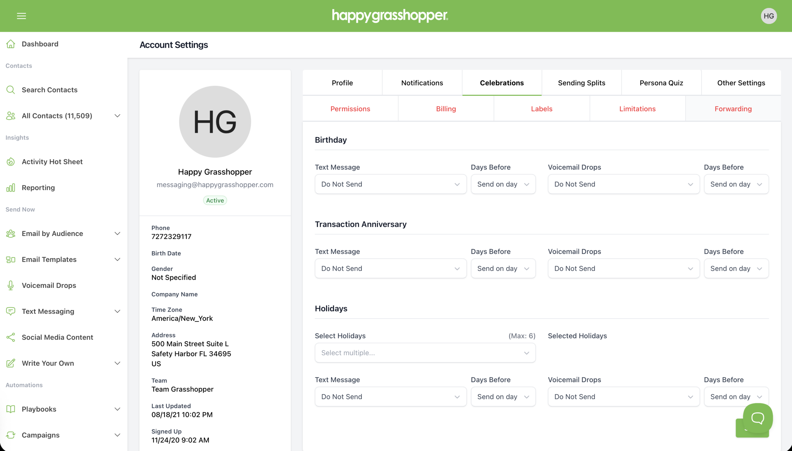 The Celebrations tab allows you to automate messages for important dates connected to your contacts.