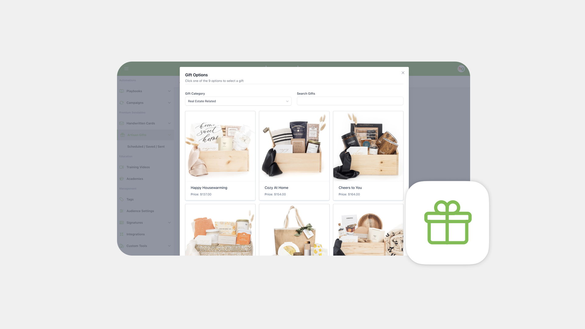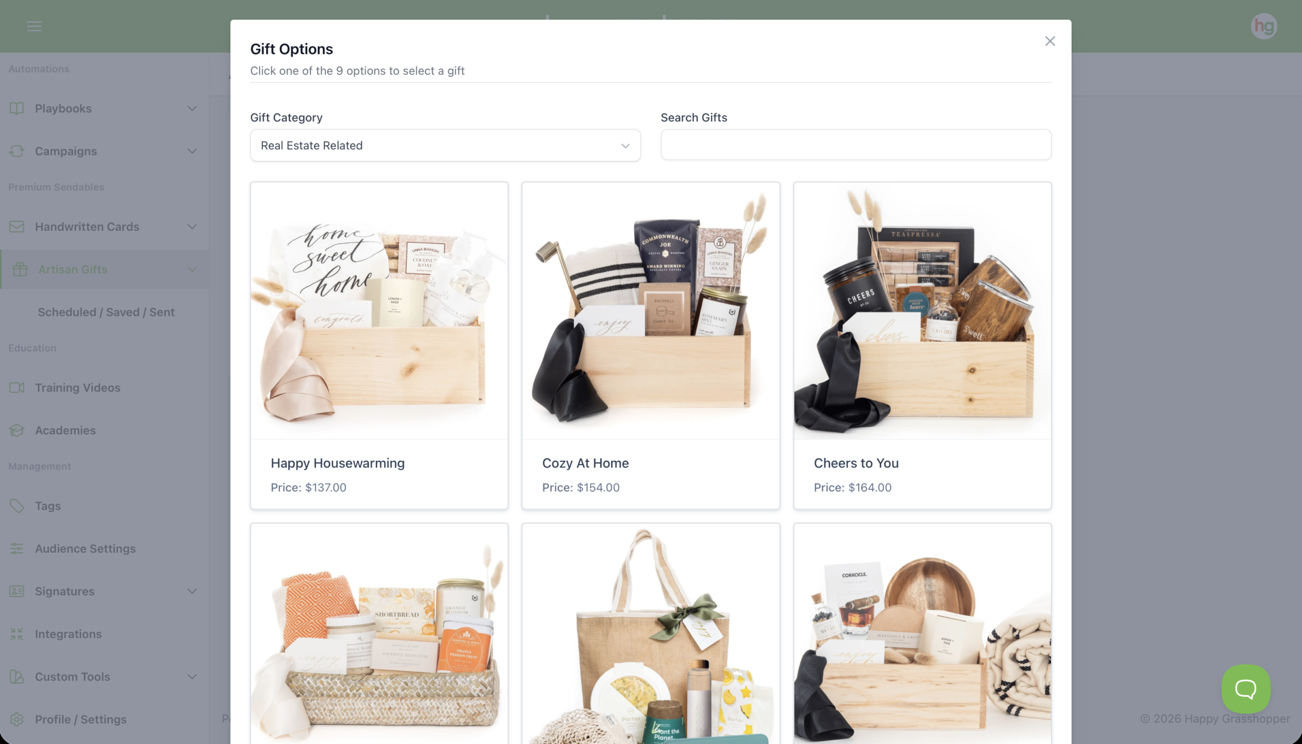 Click Create New, then hit Select a Gift. We’ve partnered with the incredible team at Marigold & Grey to offer high-quality, hand-packed gift boxes. You’ll be able to: